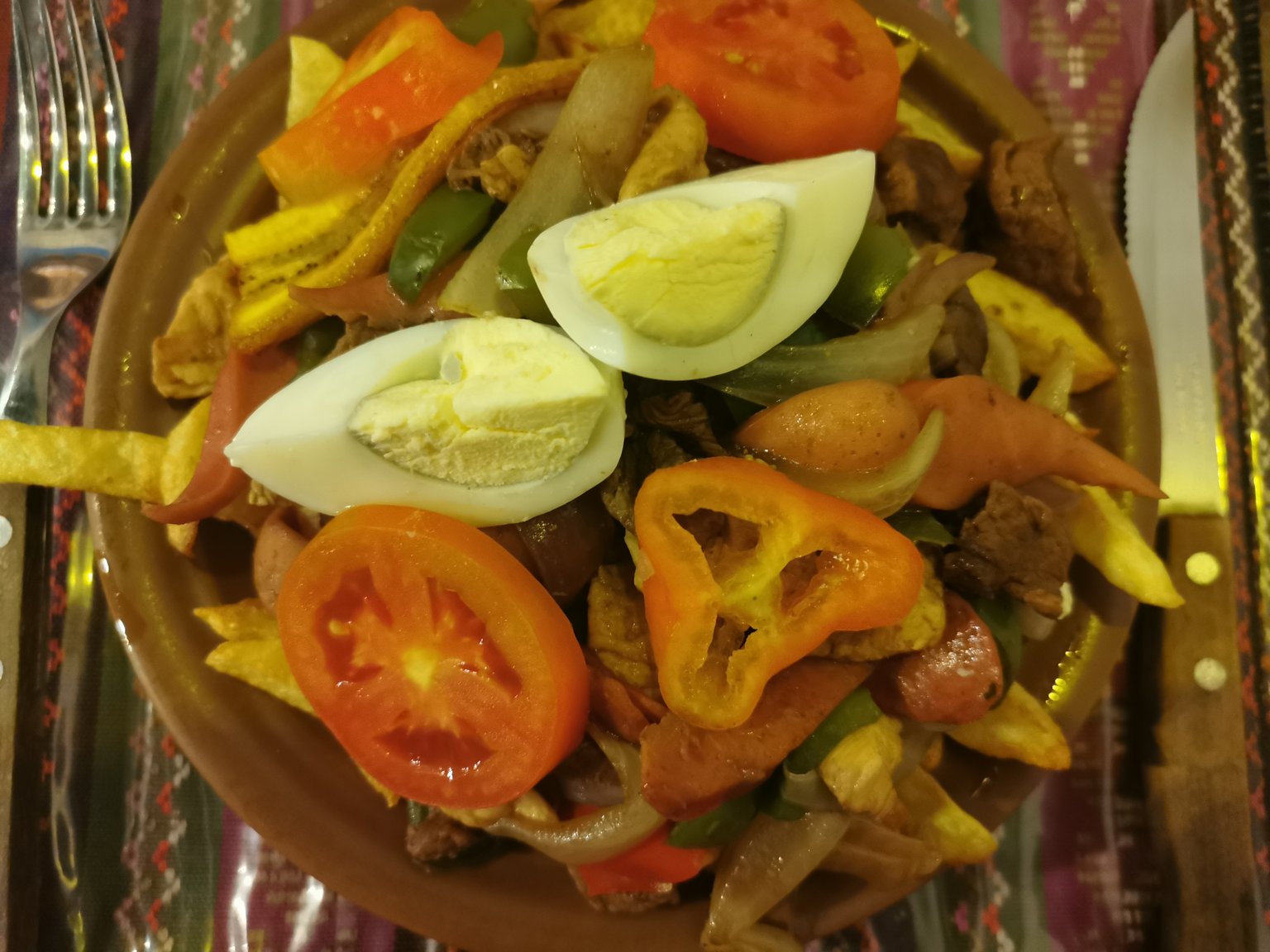 Das ist ein typisches bolivianisches Mittagsgericht mit Rindfleisch, Würstchen, Eier, Zwiebeln, Bier, Jalapeños, Tomaten und Pommes Frites. Sehr fein. Aber Achtung vor den Jalapeños, die sind sehr scharf.
