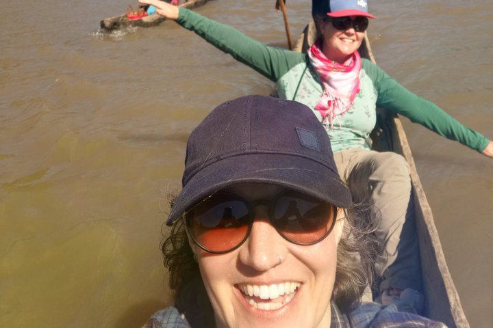 Nach einem köstlichen Mittagessen an einem Wasserfall, bei dem wir Manjok mit Vanille essen (so fein!), setzen wir unsere Fahrt in der Piroge fort. Die Gesänge von unseren Guides und den Piroguiers begleitet uns. Was für Stimmen! Wir jodeln und singen gemeinsam, denn wir finden sogar ein Lied, bei dem wir alle mitsingen können.