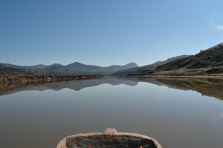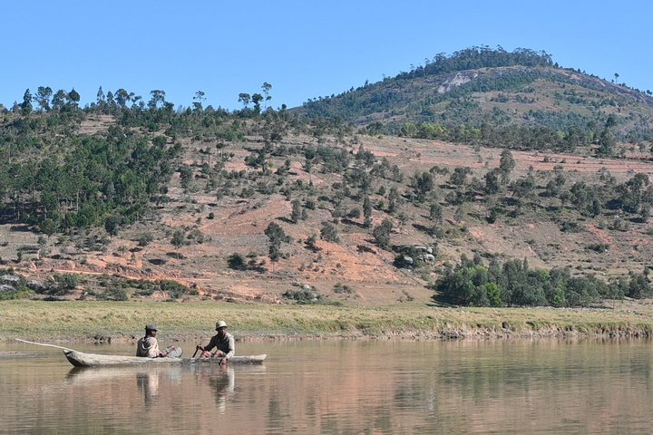 Strahlend blauer Himmel und die hügelige Landschaft spiegelt sich im Wasser. Stille. Nur das Gezwitscher einiger Vögel begleitet uns am Morgen auf unserer Flussfahrt mit der sogenannten Piroge auf dem Matsiatra-Fluss. Eine Piroge ist ein Boot, geschnitzt aus einem Baumstamm. Unsere Sitzplätze sind mit etwas Stroh gepolstert.