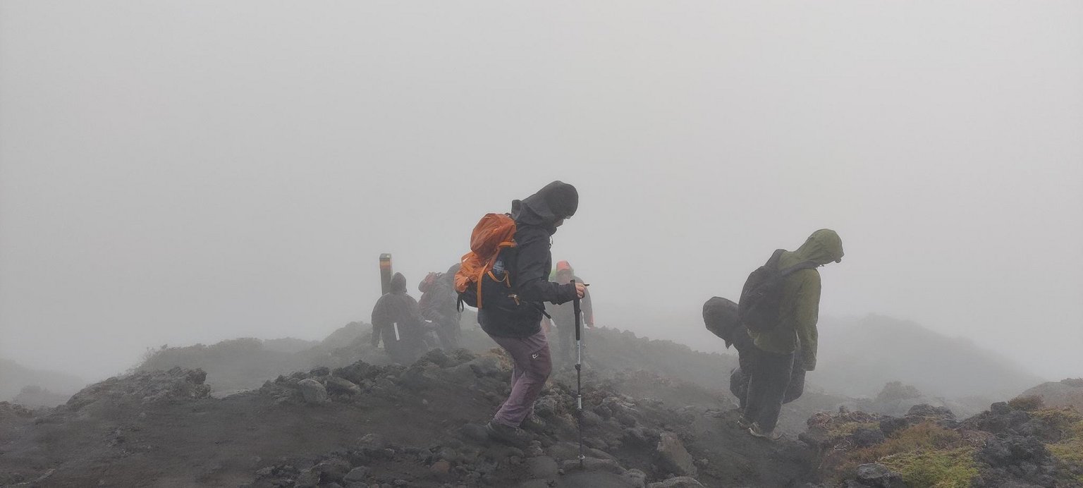 Der steinige, steile Weg ist trotz nassem Boden weniger rutschig als erwartet. Alle 200 Meter machen wir eine kurze Pause, und mir hilft es, den Aufstieg in kleine Etappen zu unterteilen. Wir folgen den markierten Pfosten, die den Weg weisen. Insgesamt sind es 47, wir sind bis zum 46. Pfosten gekommen.