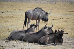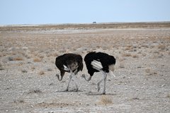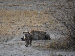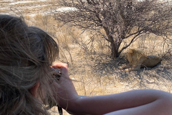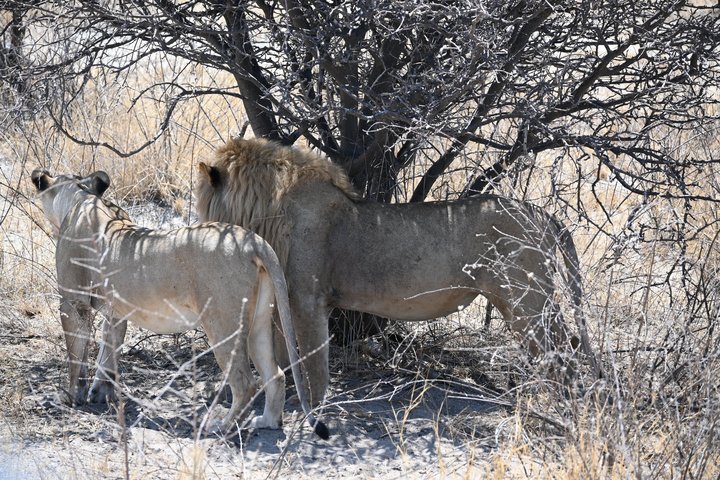 Im Etosha-Nationalpark bleiben die Löwen trotz intensiver Suche unseres Guides Ernst zunächst unauffindbar. Doch an unserem letzten Morgen bekommt er einen Tipp, wo sich eine Löwenfamilie aufhält. Nach drei Stunden Fahrt entdecken wir schliesslich die vollgefressenen Löwen, gemütlich im Schatten unter den Bäumen. Neben ihnen ihre Beute und die Geier, die sich an den Resten erfreuen. Auch unsere Freude ist gross.