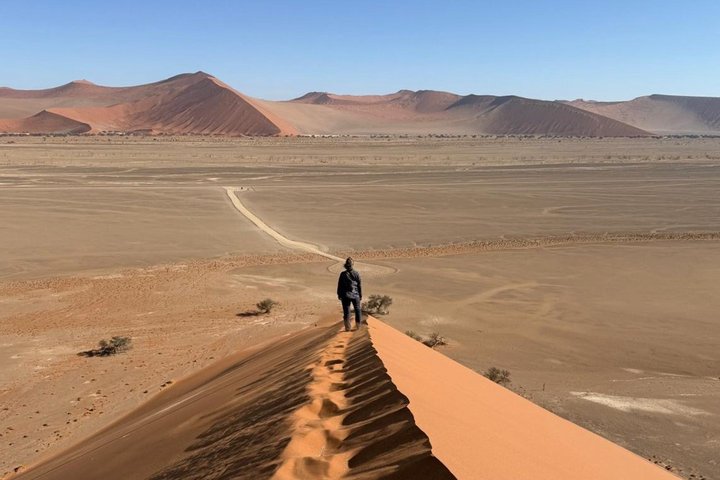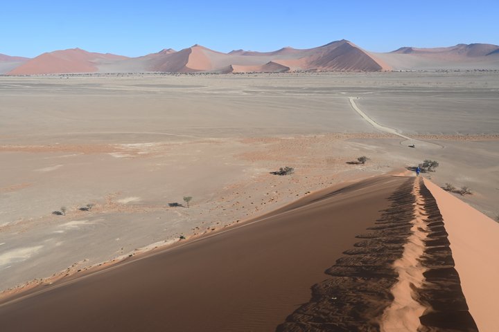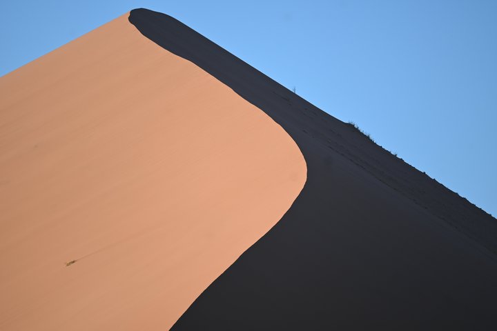 Ein besonders beeindruckendes Erlebnis ist für mich der frühmorgentliche Aufstieg auf die etwa 170 Meter hohe «Düne 40» in der Namib-Wüste. Noch etwas kühl ists, doch voller Energie machen wir uns auf den Weg. Wir sind die ersten, die Spuren im Sand hinterlassen.