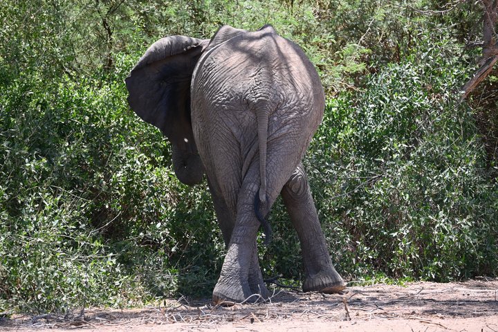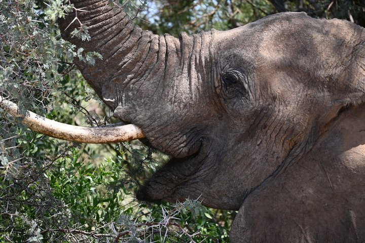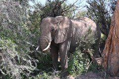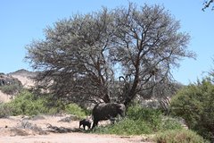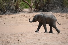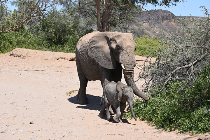 Über drei Stunden durchqueren wir die trockenen Flussbetten des Aba Huab, auf der Suche nach Wüstenelefanten. Ab und zu sehen wir frischen Dung, nicht aber die Tiere. Plötzlich strömt ein Elefantengeruch durch unsere offene Fenster und unsere Aufregung steigt. Wie aus dem Nichts stehen ein etwa ein Monat alter Elefant und seine Mutter direkt neben uns! Weil wir zu nah herangeraten sind, wirkt die Mutter unruhig. Wir fahren vorsichtig zurück, bis sie sich beruhigt.