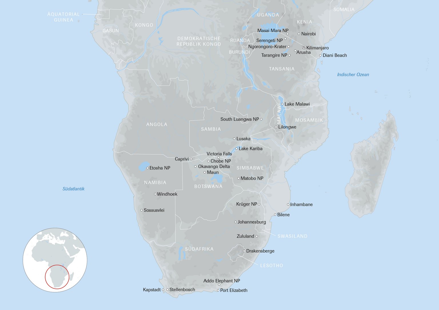 In einer Karte vereint: Unsere Safari-Destinationen in Afrika mit ausgewählten Highlights
